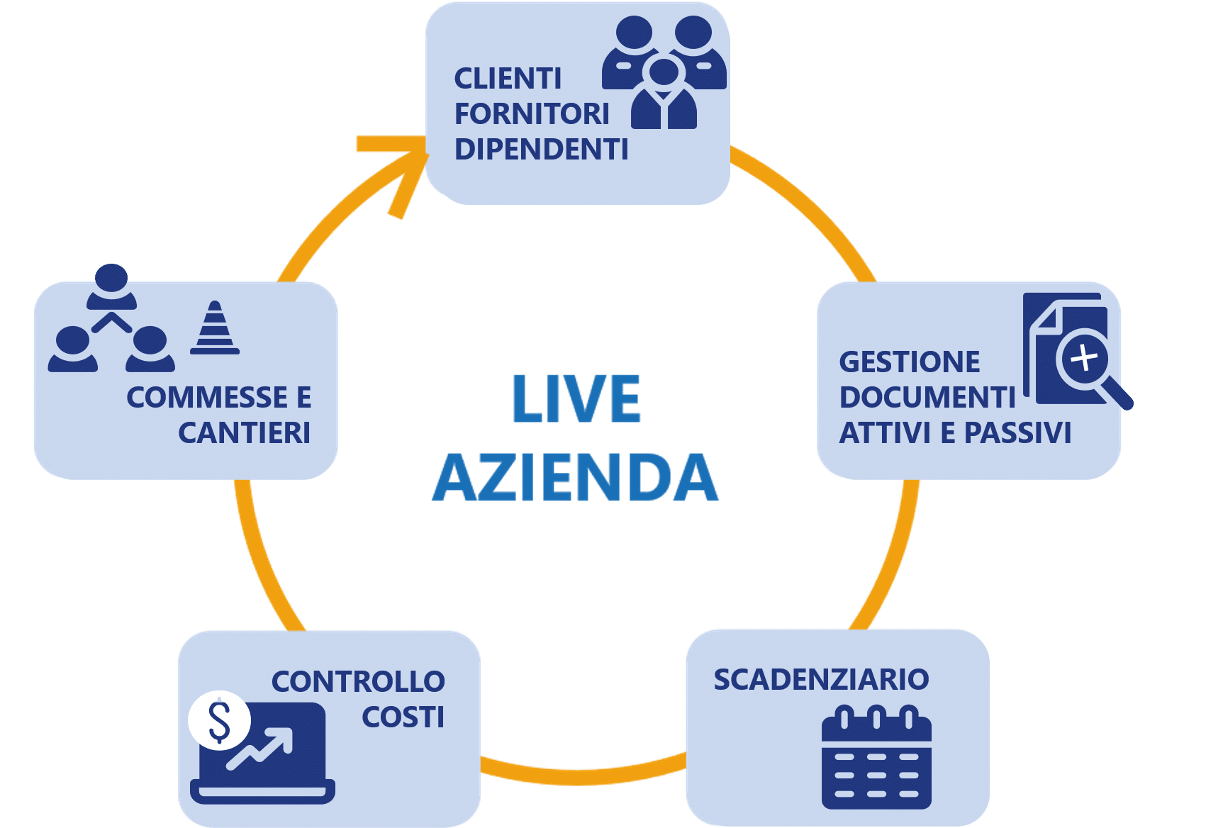 Live Azienda è l’ERP che copre le fasi di gestione aziendale, ideale per una piccola azienda senza la complicazione della gestione della contabilità interna.